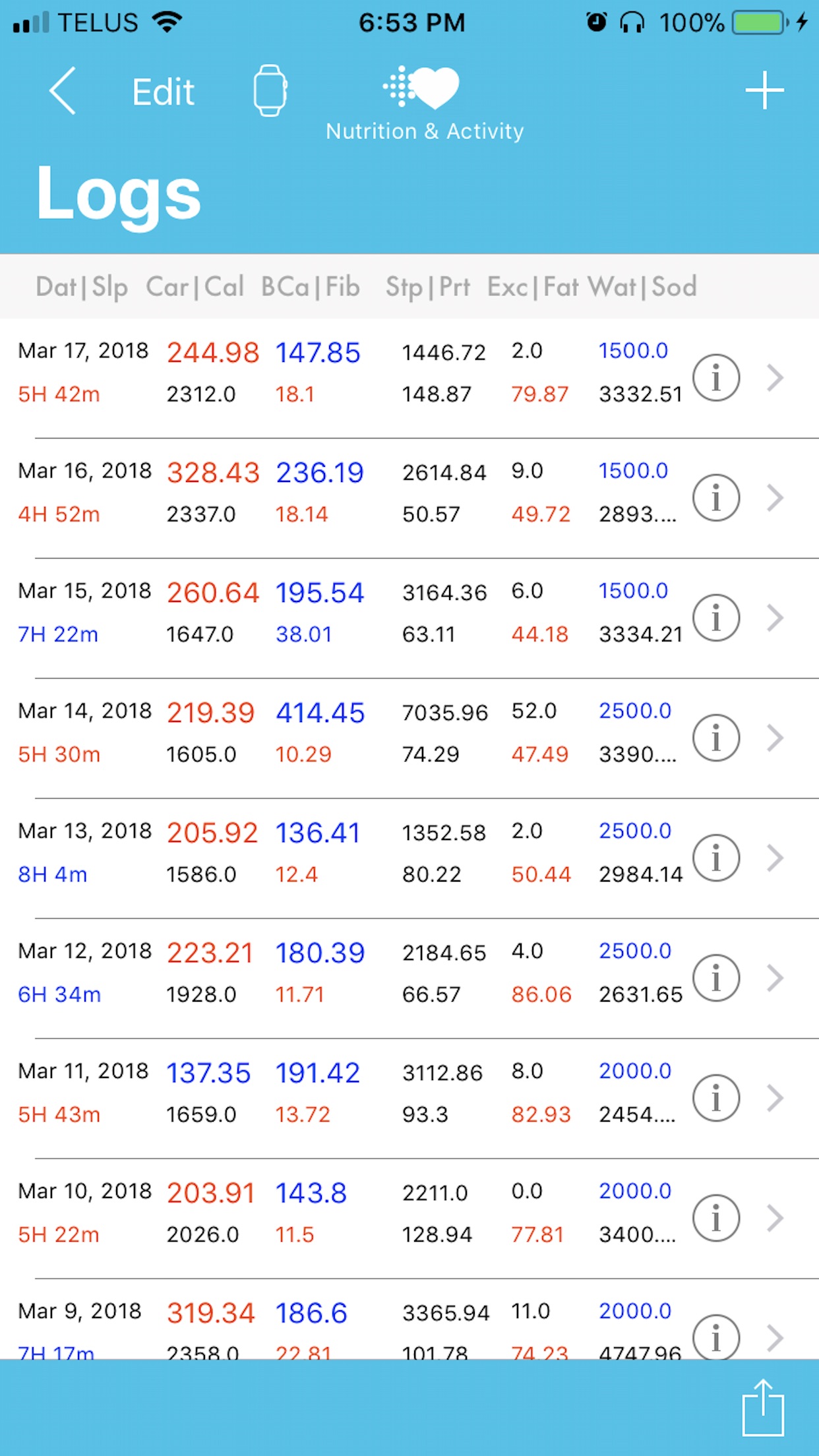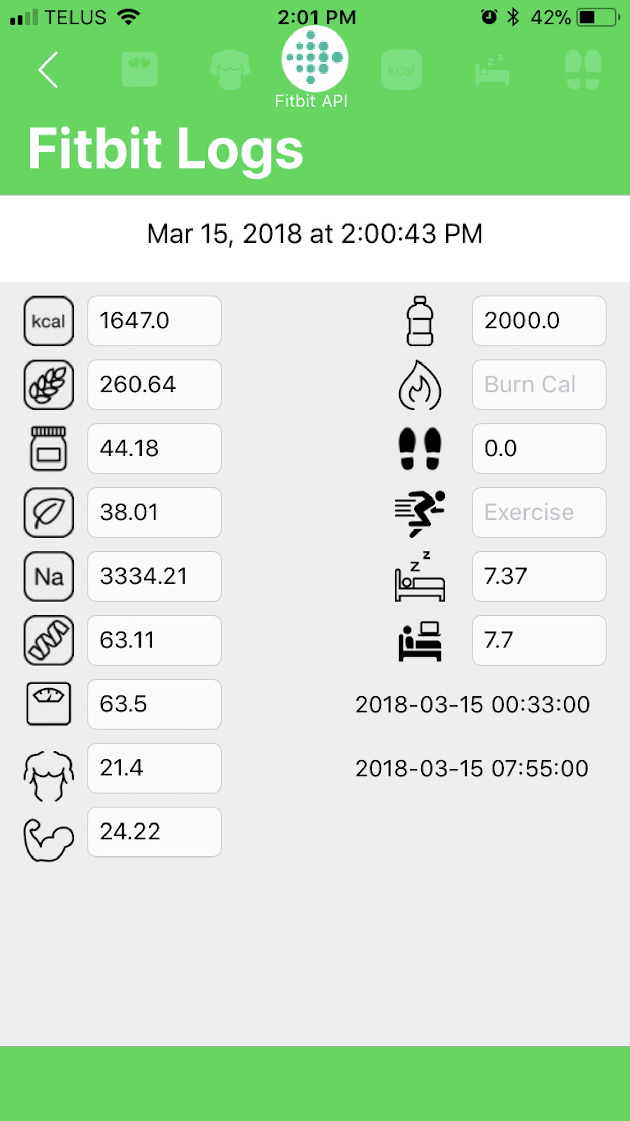 Calories, carbs, fat, fiber, protein, sodium, water, cholesterol are pulled from “Nutrition+ app” or "glucoseplusapp.com" "and pushed to “Apple Watch” as well. Burned calories, steps, sleep data are pulled from “Nutrition+ app” and pushed to “Apple Watch” & "Health"